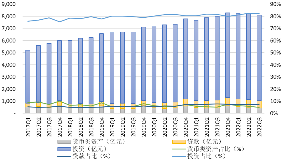 三是固有资产中投资运用方式进一步占据主导。2022年3季度末固有资产通过投资方式运用的规模达到7041.78亿元,同比增长108.76亿元,增幅1.57%,环比降低1.06%,占比达到82.24%,同比进一步提升0.71个百分点,且2022年连续3个季度的占比均保持在80%以上。贷款方式运作的规模为628.73亿元,同比下降22.58亿元,降幅3.47%,环比下降1.27%,占比为7.34%,同比略降0.32个百分点,相对占比自2018年2季度跌至谷底以后总体保持小幅回升态势。货币类资产规模为412.53亿元,同比下降2.88%,环比下降16.40%,占比4.82%,同比略降0.18个百分点,占比总体呈现持续下降态势。